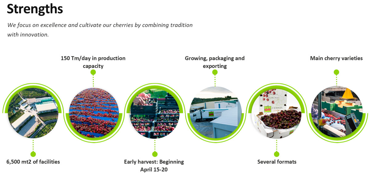 The range of varieties available to CERIMA Cherries is wide, which allows us, together with the combination of the layout of its farms, to be able to offer very good quality cherries over a long period of time.
